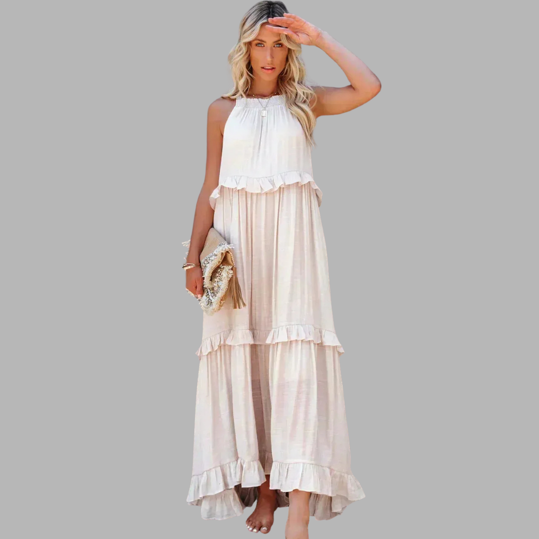 Molly – Uten ermer kjole er nettopp det. Med sine myke volanger og smigrende uten ermer design, bringer Molly en grasiøs sjarm som er perfekt for enhver solfylt utflukt eller spesiell anledning. Enten du skal på middag ved stranden eller nyte en avslappet helgelunsj, vil denne kjolen få deg til å føle deg vakker og selvsikker.